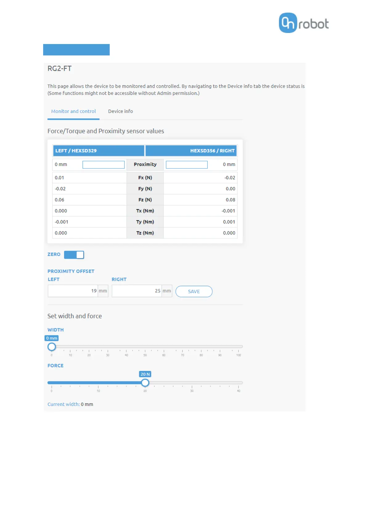 The force and torque values (Fx,Fy,Fz and Tx,Ty,Tz) are shown in N/Nm along with the Proximity sensor