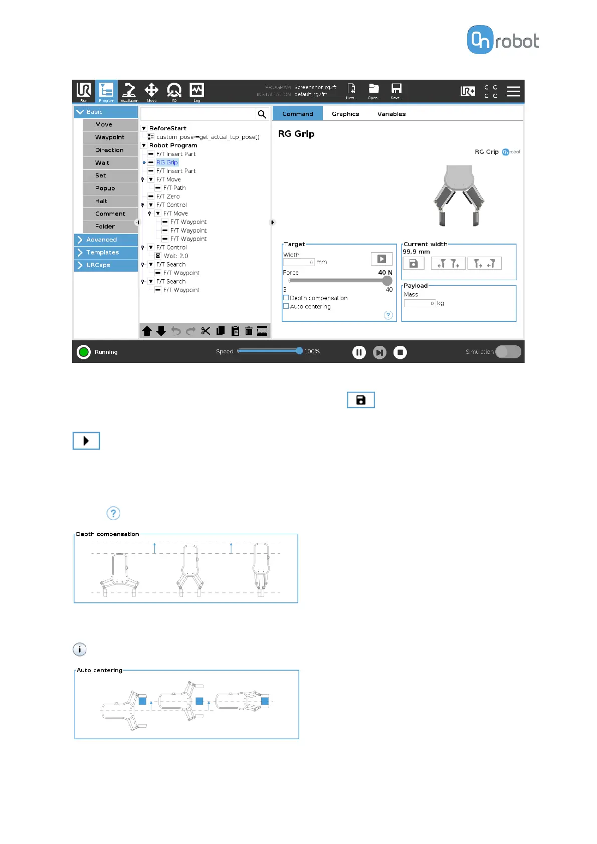 Auto centering: if checked, during closing and opening the gripper, the robot moves the