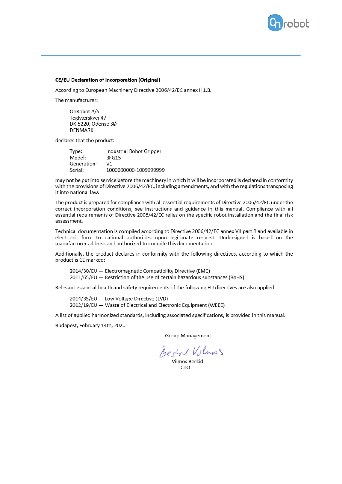 OnRobot VGC10 - Declaration of Incorporation; 3 Fg15