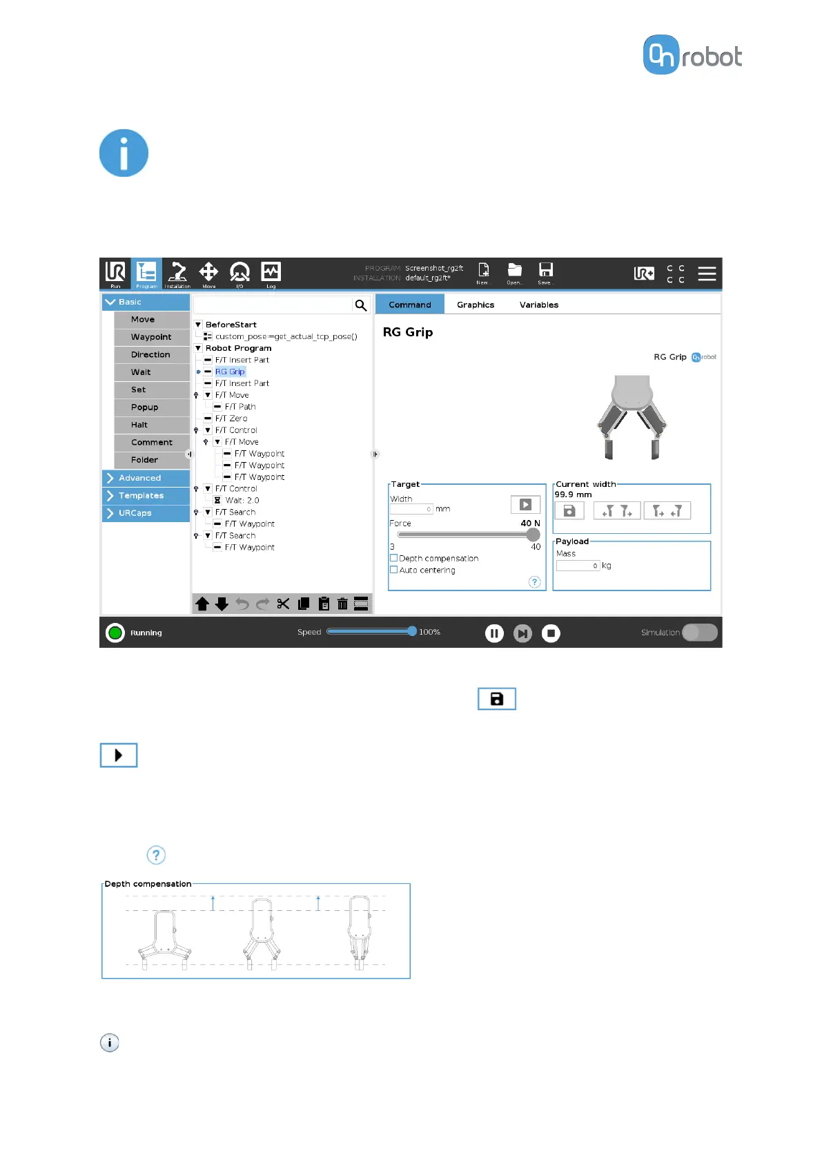 Depth compensation: If checked, during closing and opening the gripper, the robot moves to