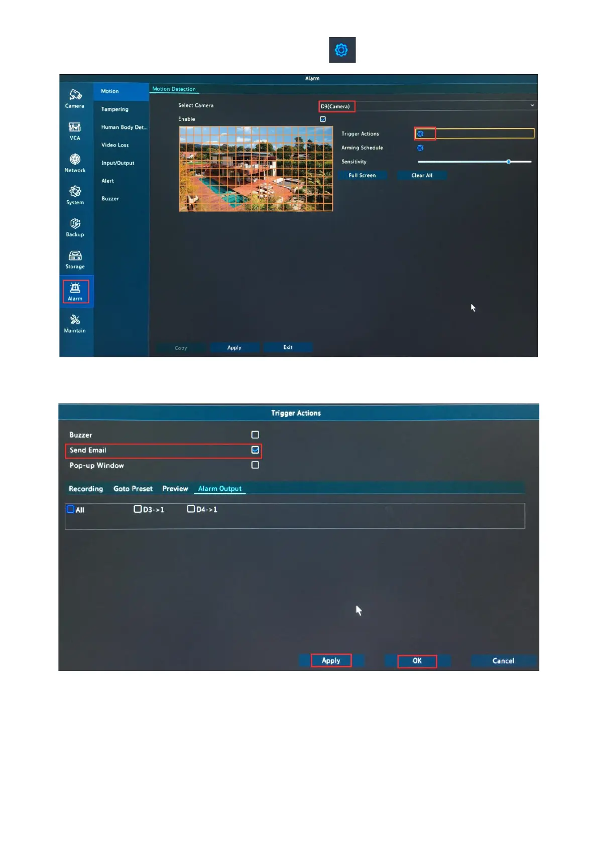 5. Click Alarm--> Motion, select camera and click behind Trigger Actions.