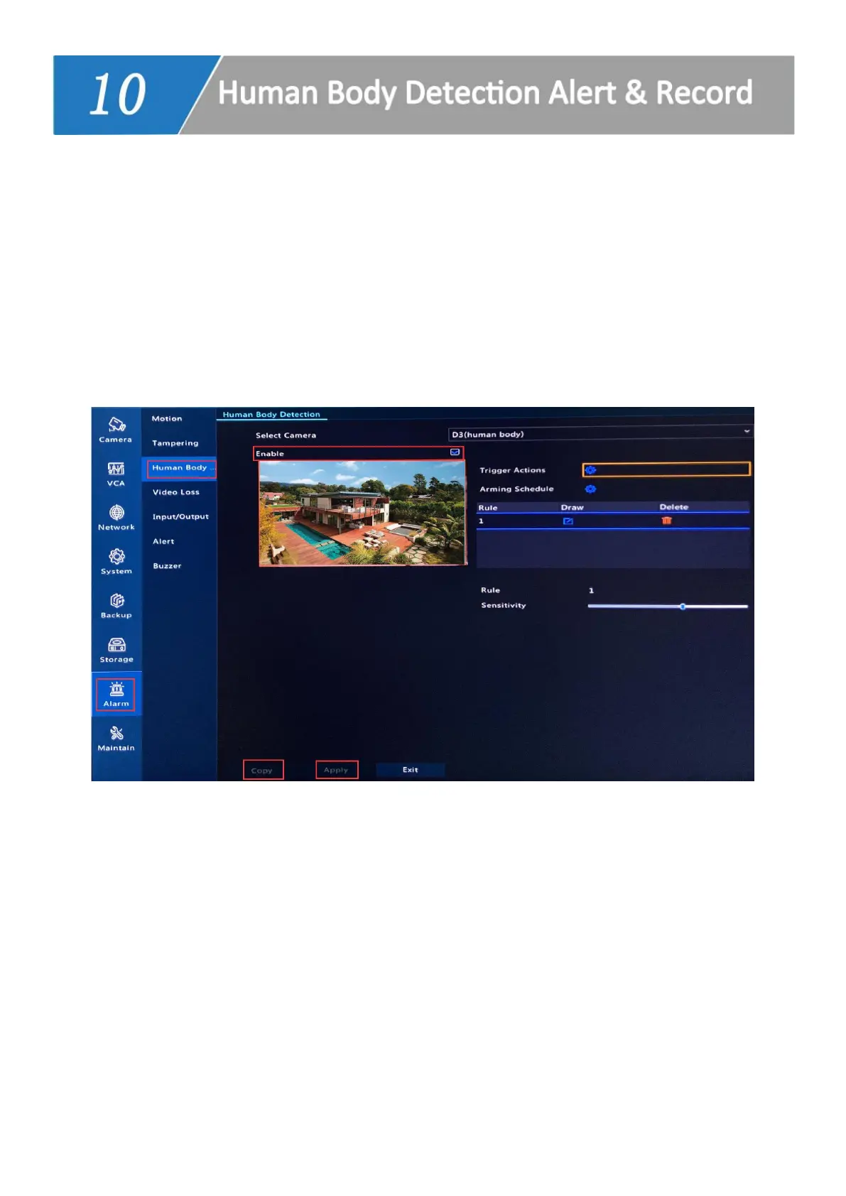 1. Right click on the NVR monitor, choose Menu-->Alarm-->Human Body Detection. Select