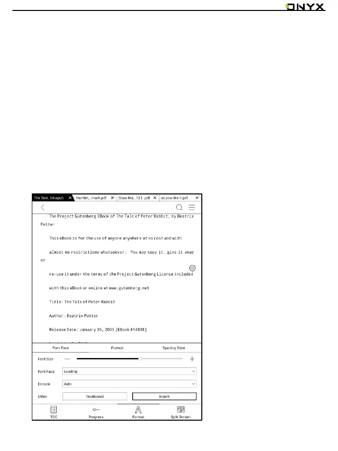 TOC, Format, Progress and Split screen are included. It supports the formats