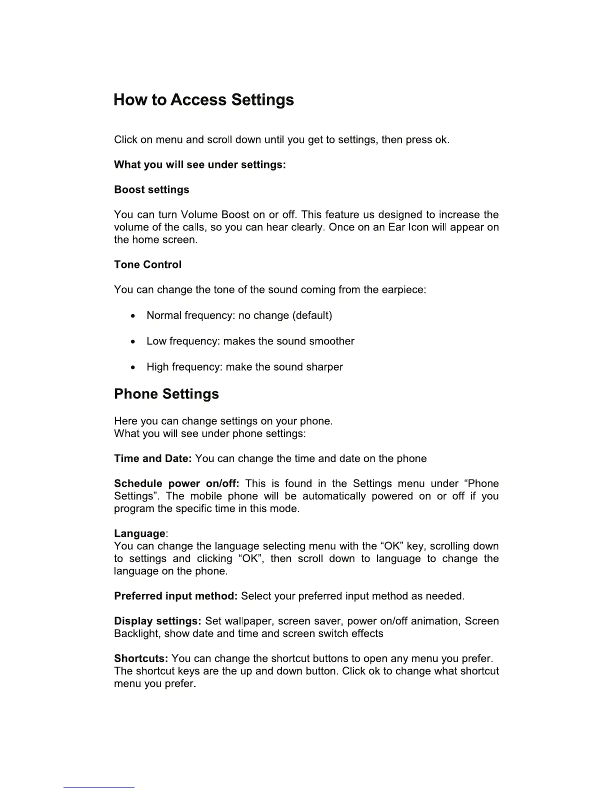 Opel mobile BigButtonPhone - Access Settings; Boost Settings and Tone Control; Phone Settings: Time, Date, and Language; Phone Settings: Power, Input, and Display