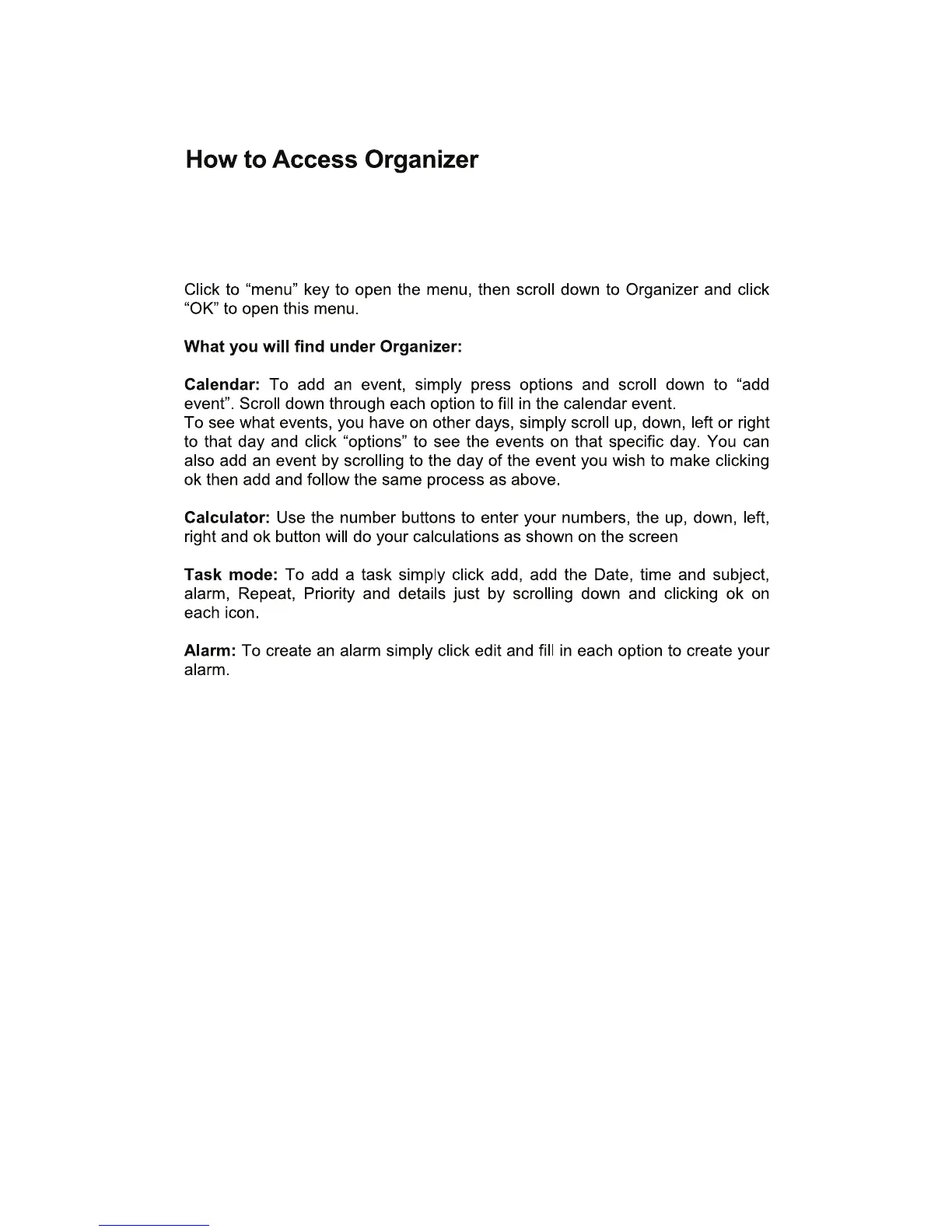 Opel mobile BigButtonPhone - Access Organizer; Calendar and Event Management; Calculator and Task Management; Alarm Creation and Settings