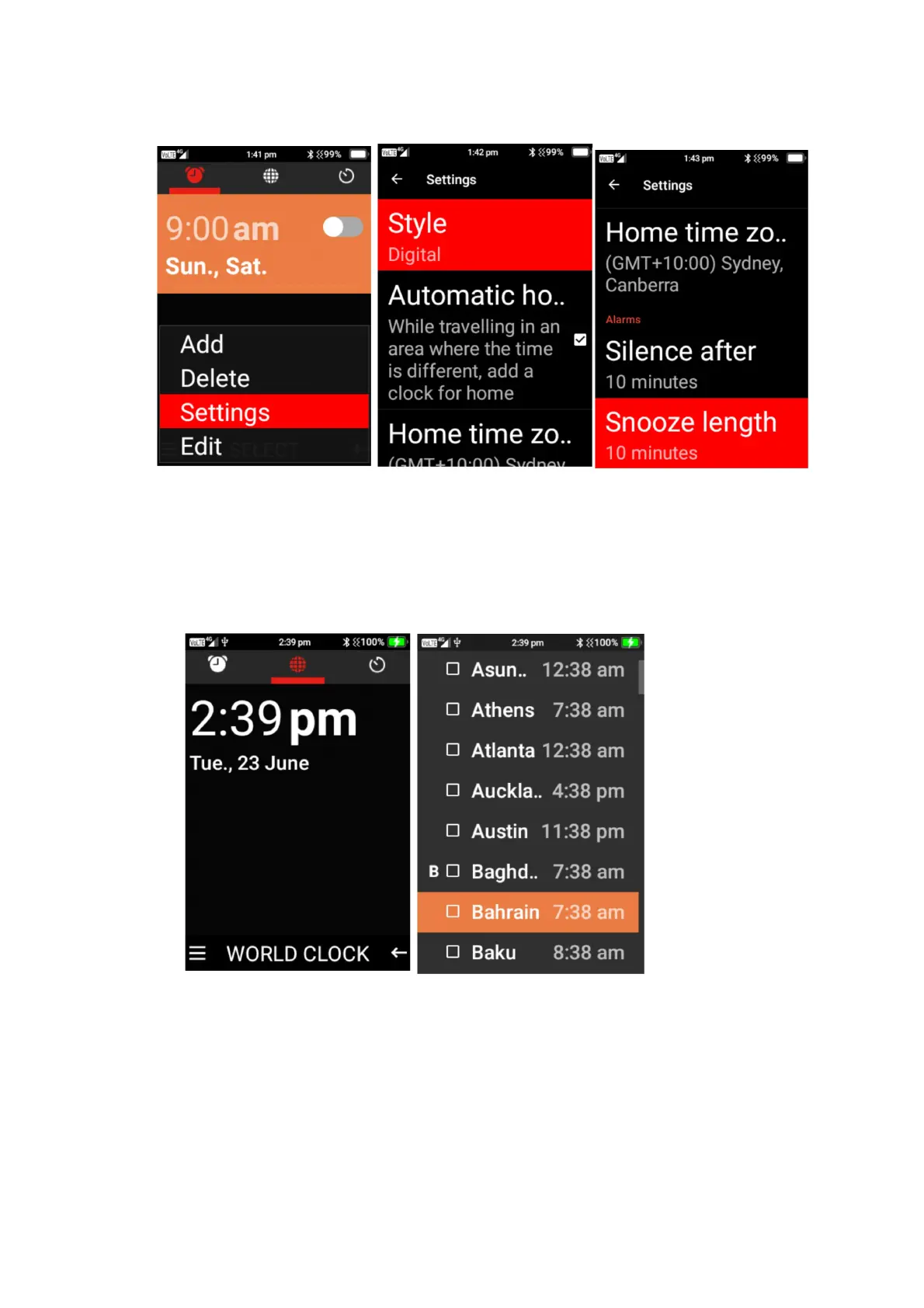 options, home time zone options, silence alarms after a period of time and Snooze time