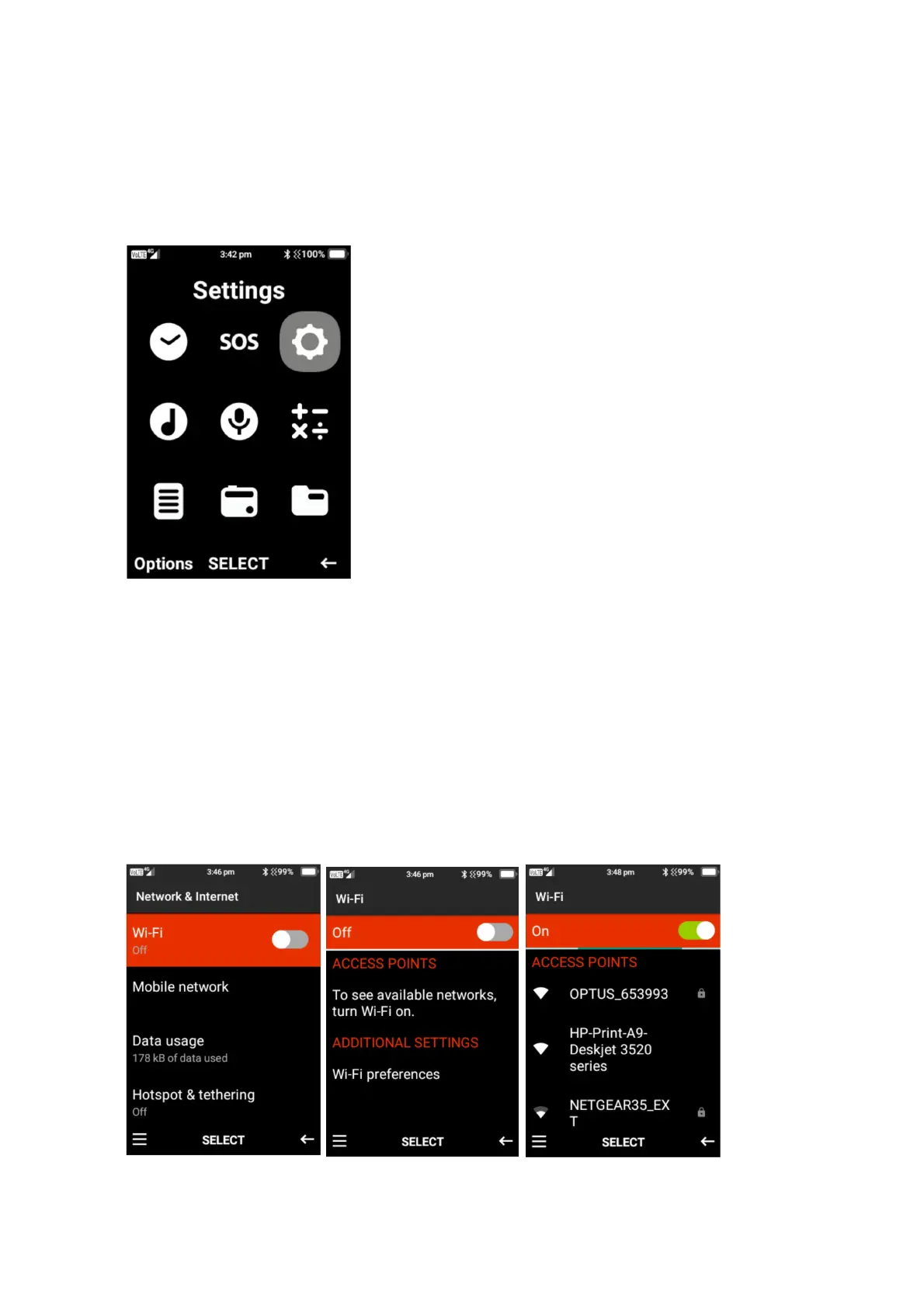 1. Wi-Fi – Press select on Wi-Fi to open the Wi-Fi menu. Press select on off to turn the Wi-Fi