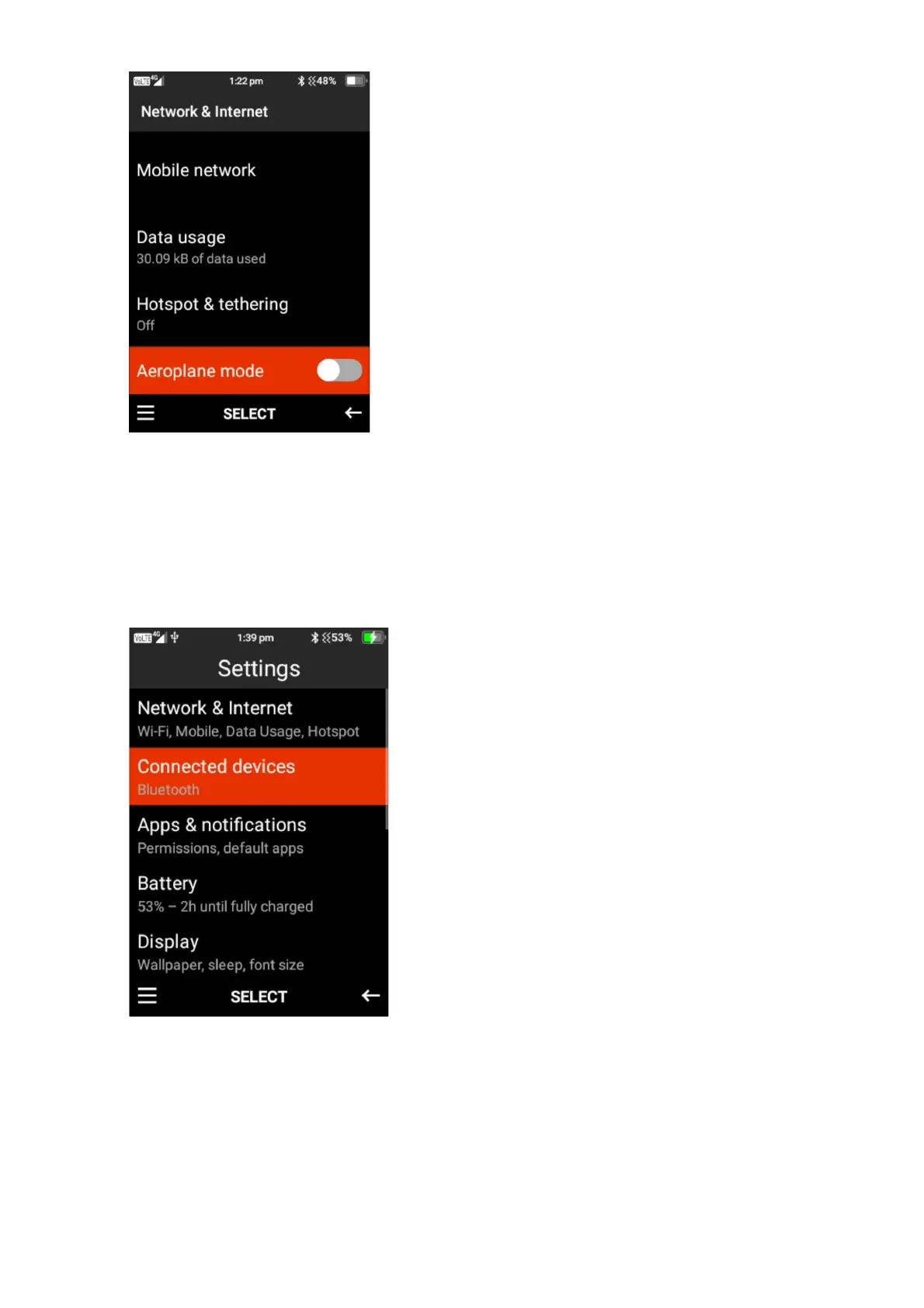 1. Connect via Bluetooth – Press select on Bluetooth and turn Bluetooth on by pressing