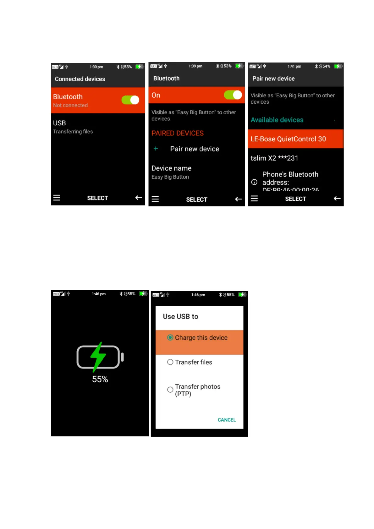 port. Once connected it will show it is charging, press select to change to transfer files or