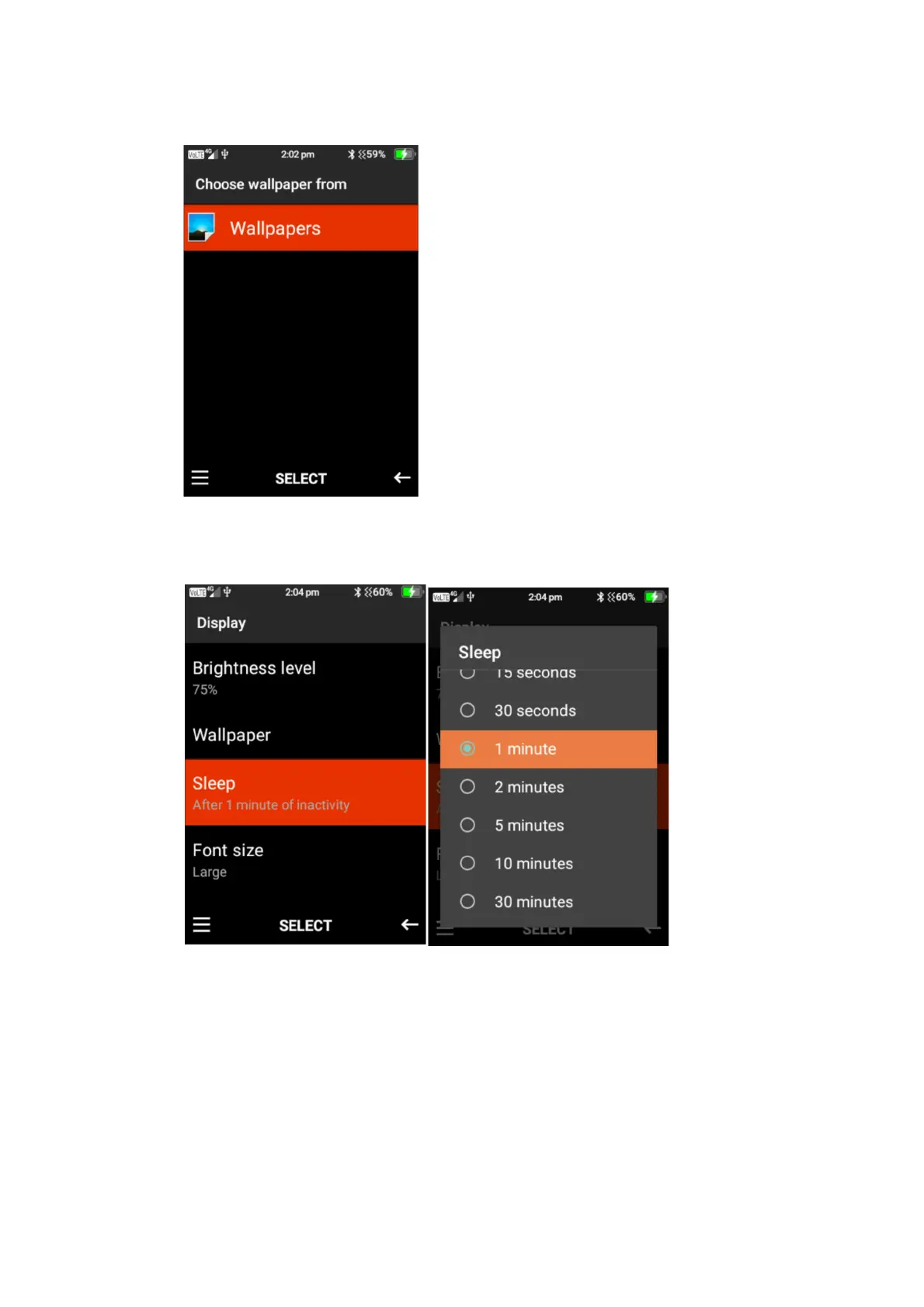 3. Sleep – Here you can adjust the screen timeout timer. Press select and then highlight the