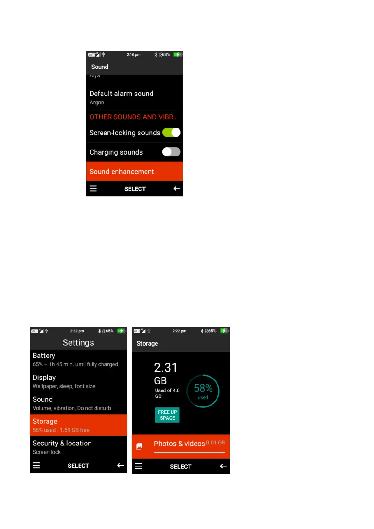 sounds, charging sounds and sounds enhancement on on or off. Press select on these