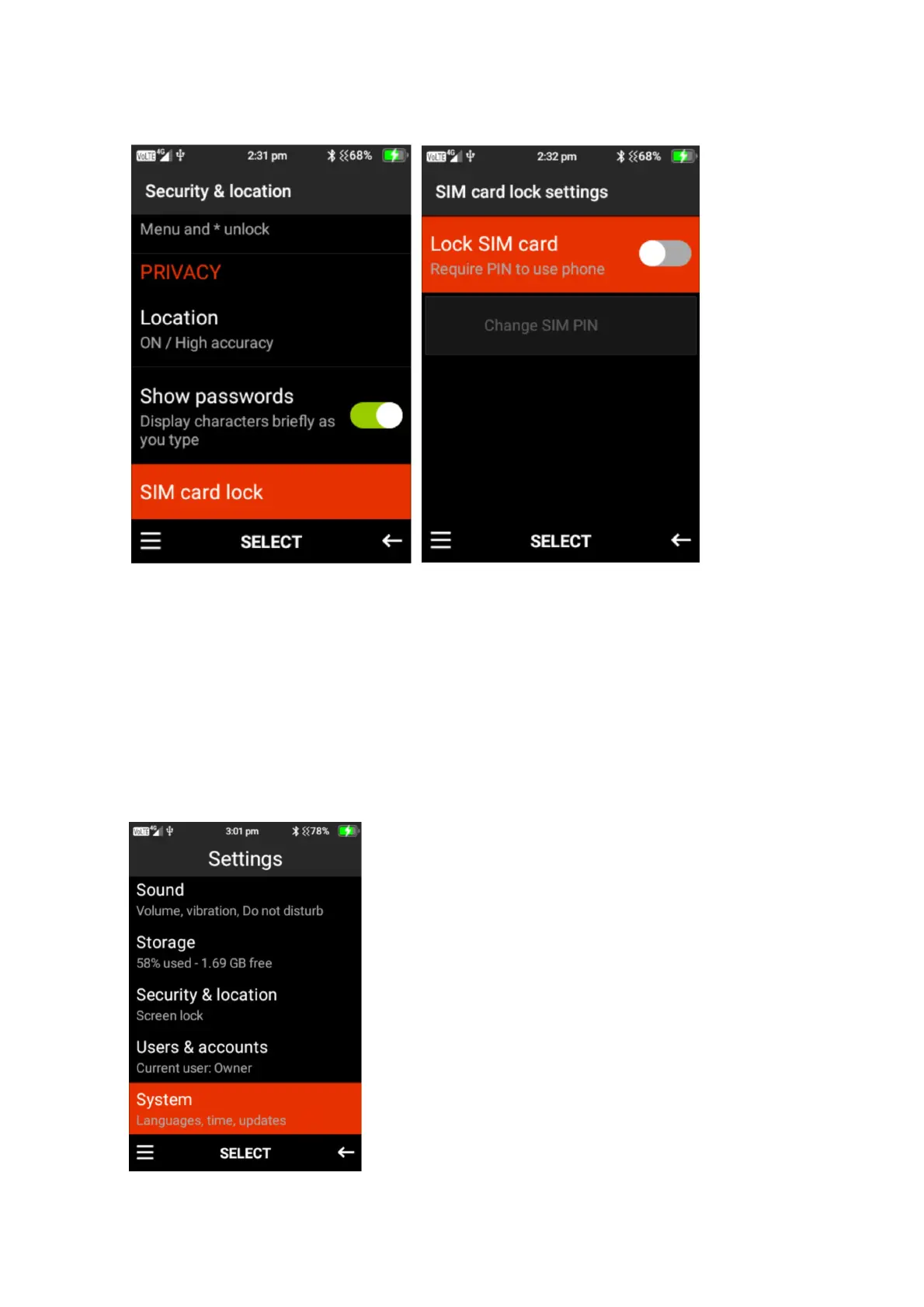 4. SIM Card Lock – Here you can turn SIM Card lock on or off. Press select and type in the