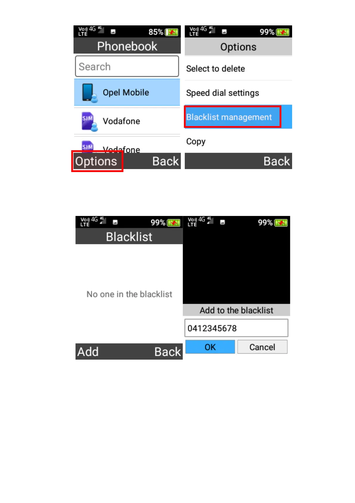 To remove a phone number from blacklist, highlight it and press OK key to remove it.