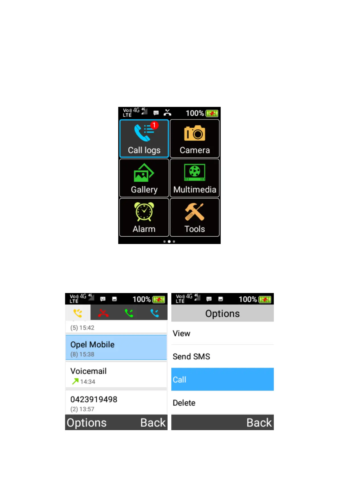 To access Call logs, scroll across the home screen using the cursor keys and press OK key on