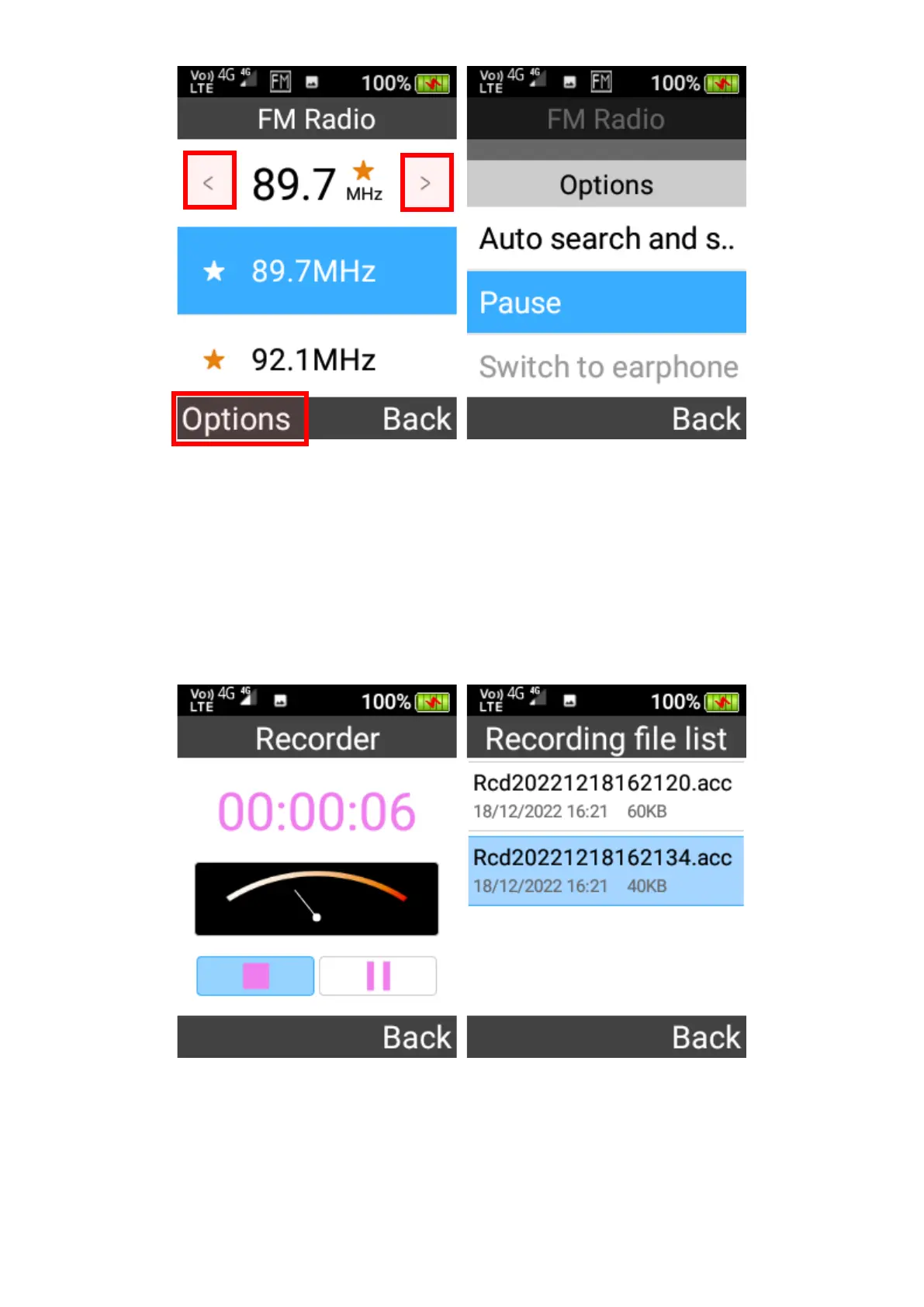 Pause, save recording, Cancel saving and Open recording file list.