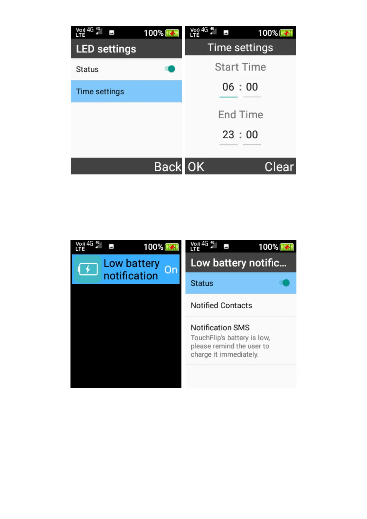 Special functions – Low battery notification – When battery capacity is lower 10%, the phone