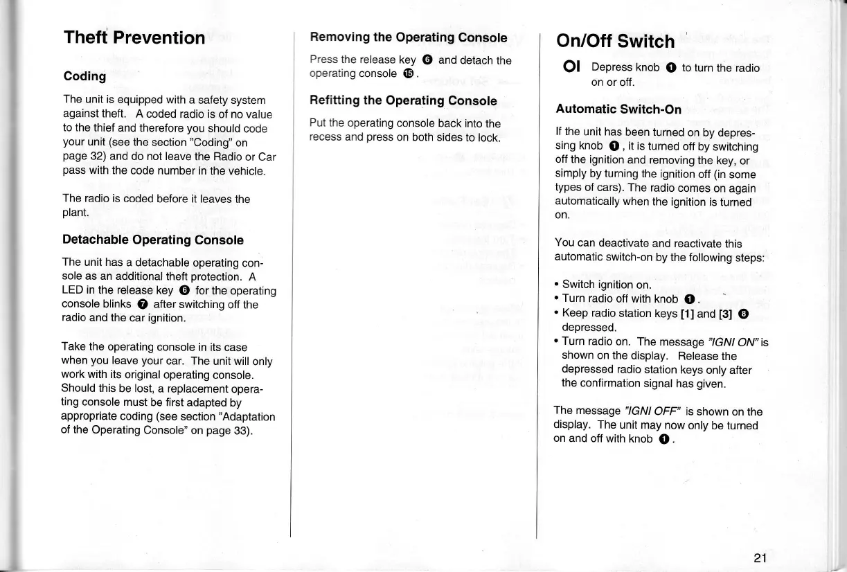 Opel CDR 500 - Theft Prevention; Coding; Detachable Operating Console; On;Off Switch