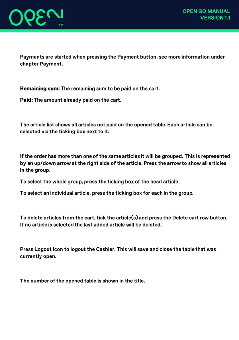 Open Go - Payment; Sum of the Cart; Article List; Grouped Articles