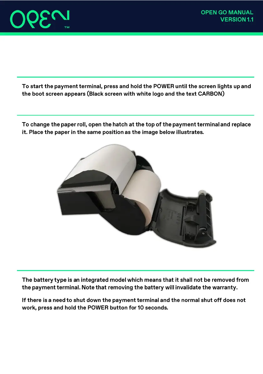 Open Go - OPEN GO Payment Terminal; Power up the Payment Terminal; Change Paper Roll; Battery Info