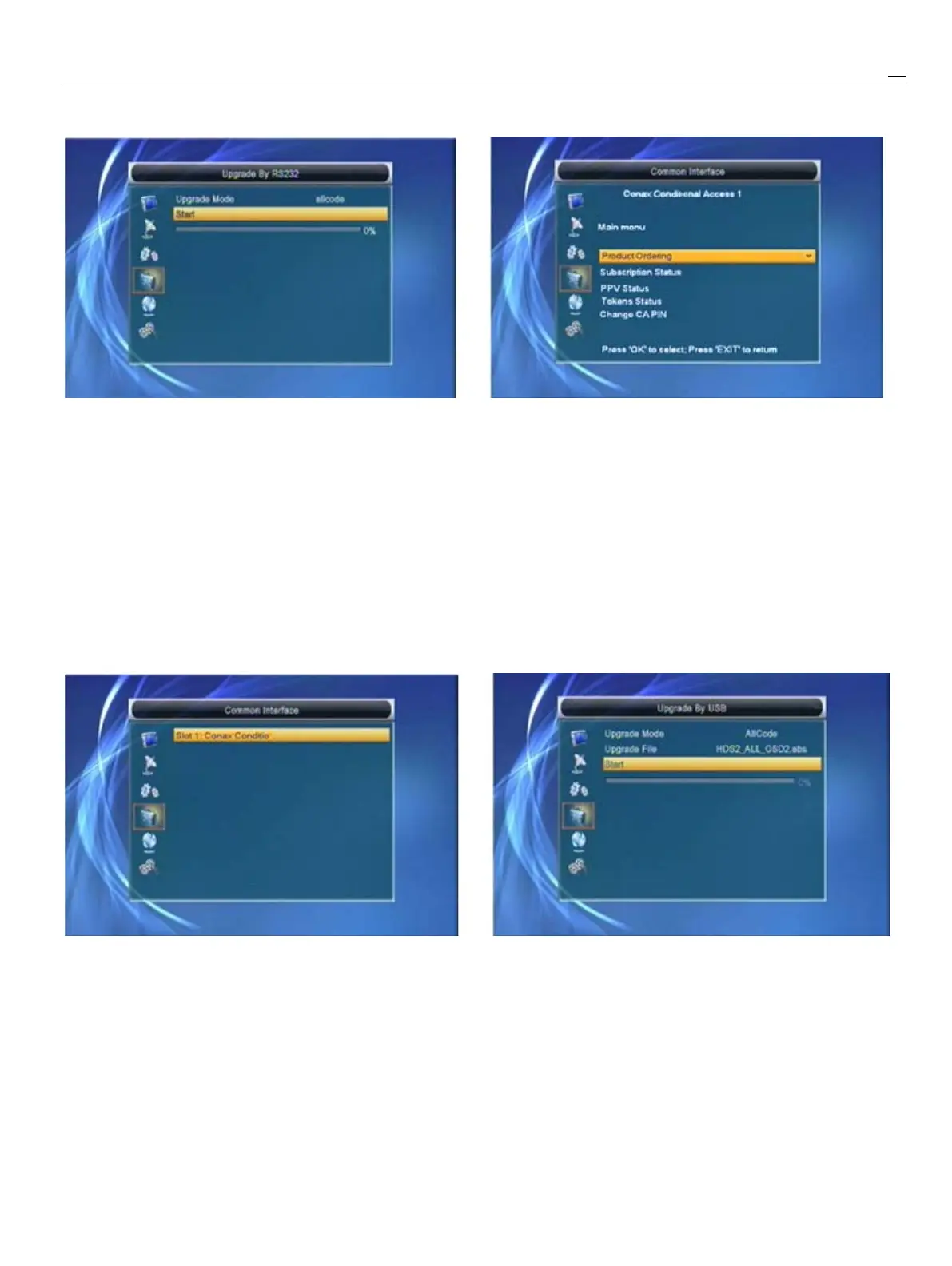interface.Enter“UpgradeByRS232”menureceiverandstringisaccordingtoCIcarditself.So,