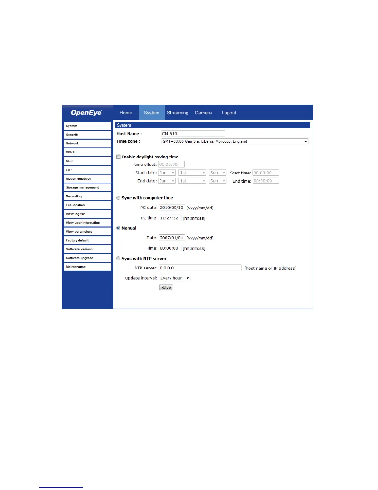 your camera’s clock with a NTP server. Specify the server you wish to synchronize in the