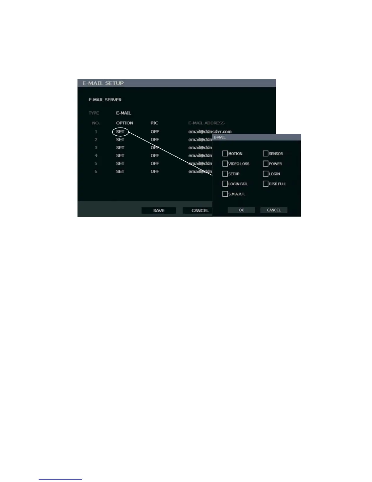 E-MAIL SERVER – DVR / SMTP [Configure the recorder to use selected e-mail server.]