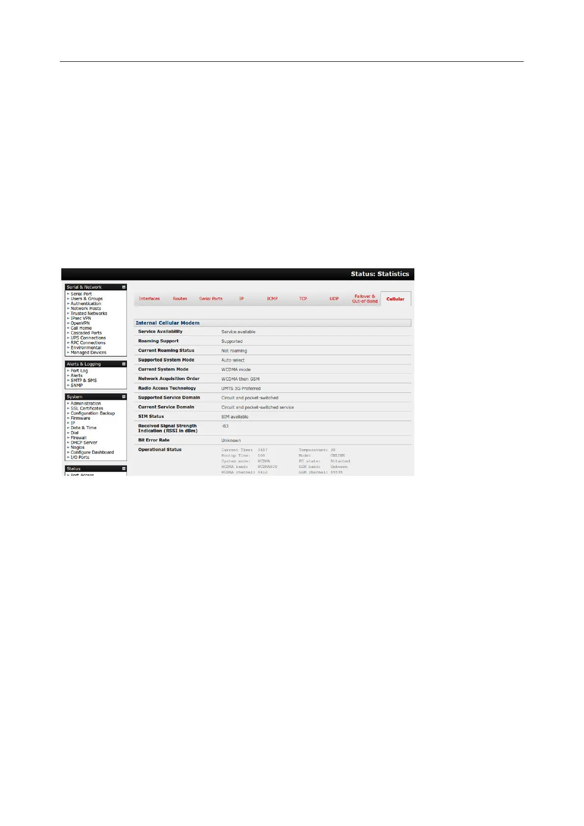 5. The Cellular statistics page on Status > Statistics displays the current state of the modem