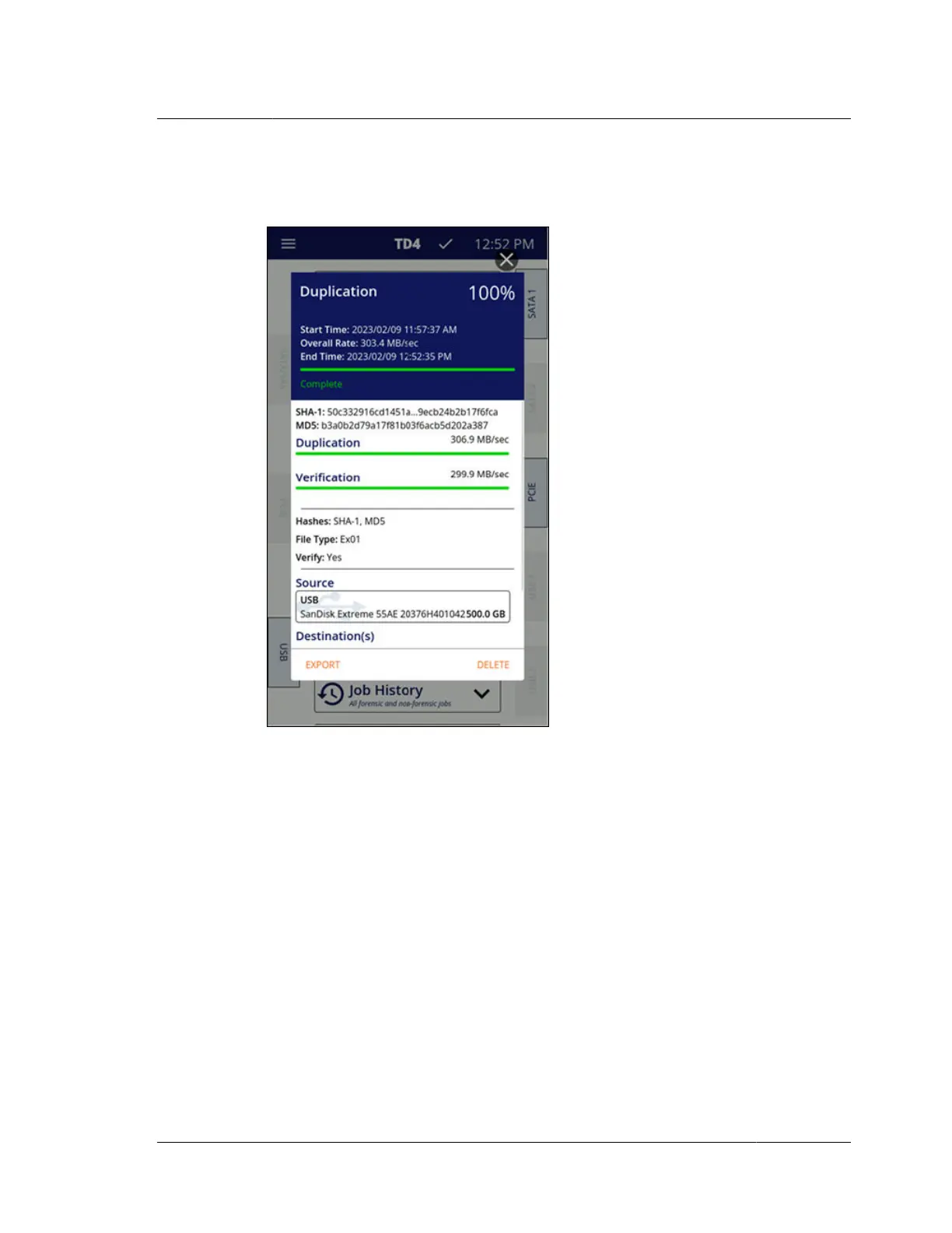 Once a job has completed, the job status screen is displayed and shows the final