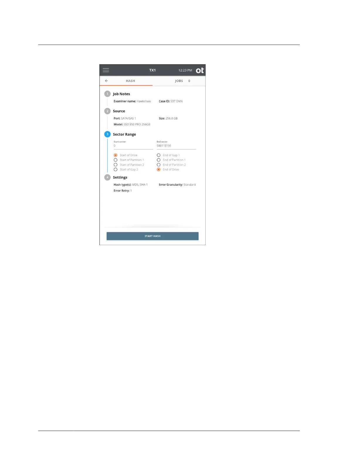4. To cancel the hash operation, close the Job Status screen by tapping the X in the