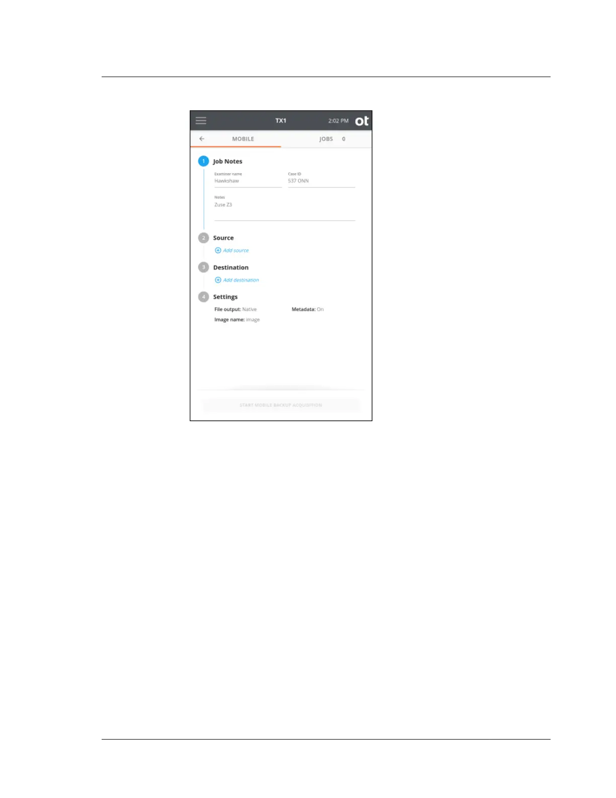 selection section of the mobile backup acquisition job setup screen to indicate the