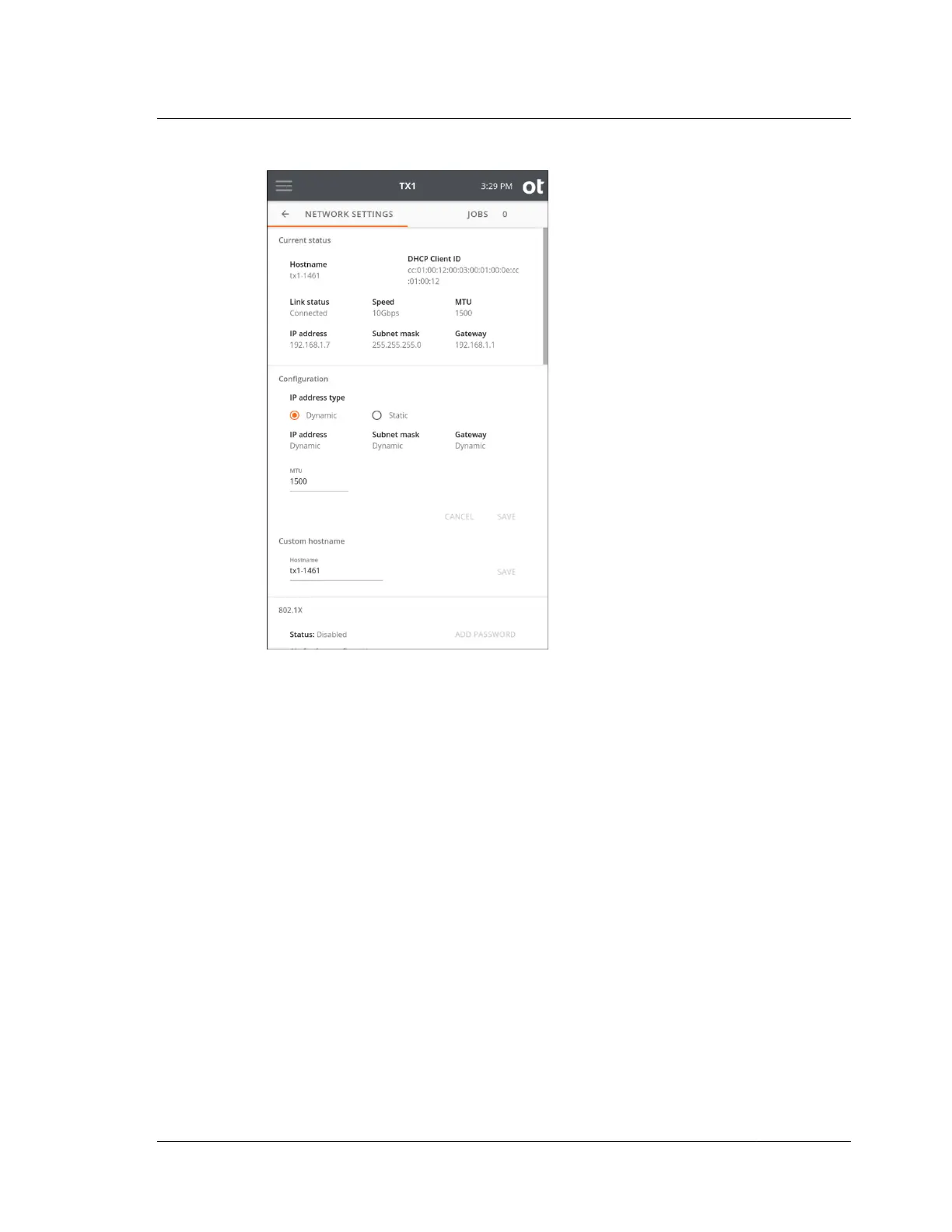 address, MTU (maximum transmission unit) value, and custom hostname.