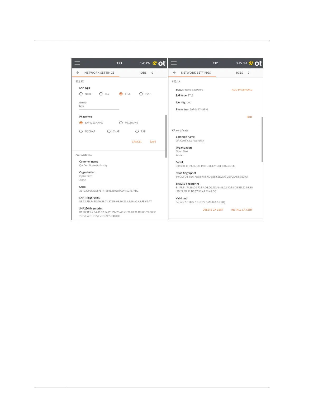 MSCHAPv2). A CA certificate must be installed on TX1 to enable server