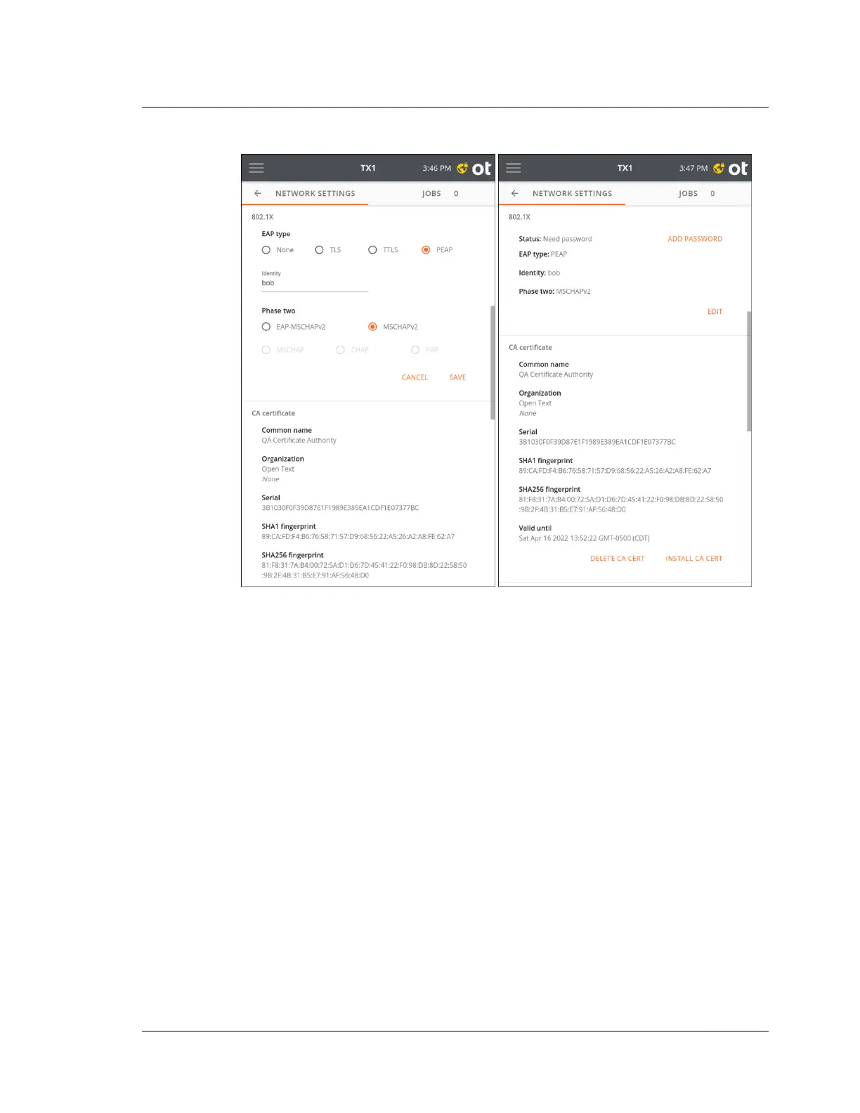 bar icon or Add Password to enter an 802.1X passphrase/password. Tap Submit to