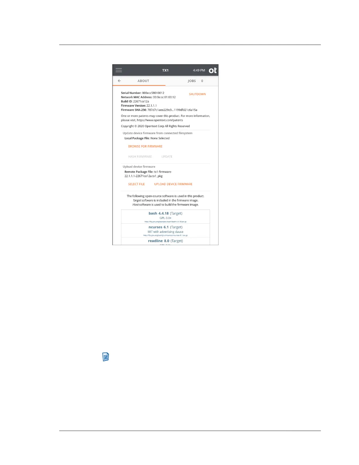8. On the About screen, double check the name of the selected firmware package