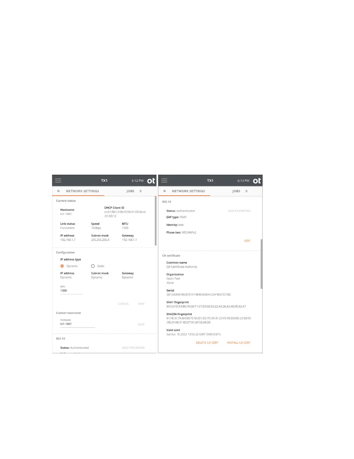 Configuration, Custom hostname, 802.1X settings, CA certificate, Client