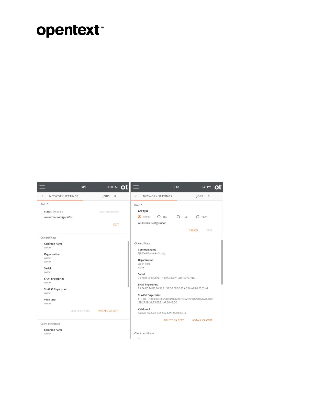 To begin setting up your TX1 for use on a network with 802.1X authentication, tap the