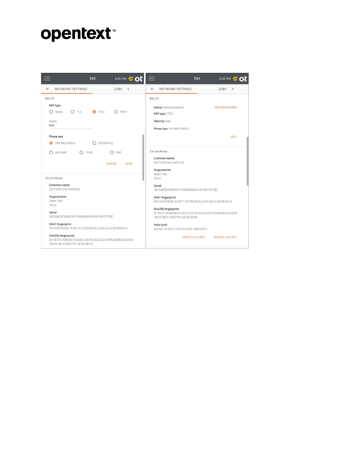 MSCHAPv2). A CA certificate must be installed on TX1 to enable server authentication.
