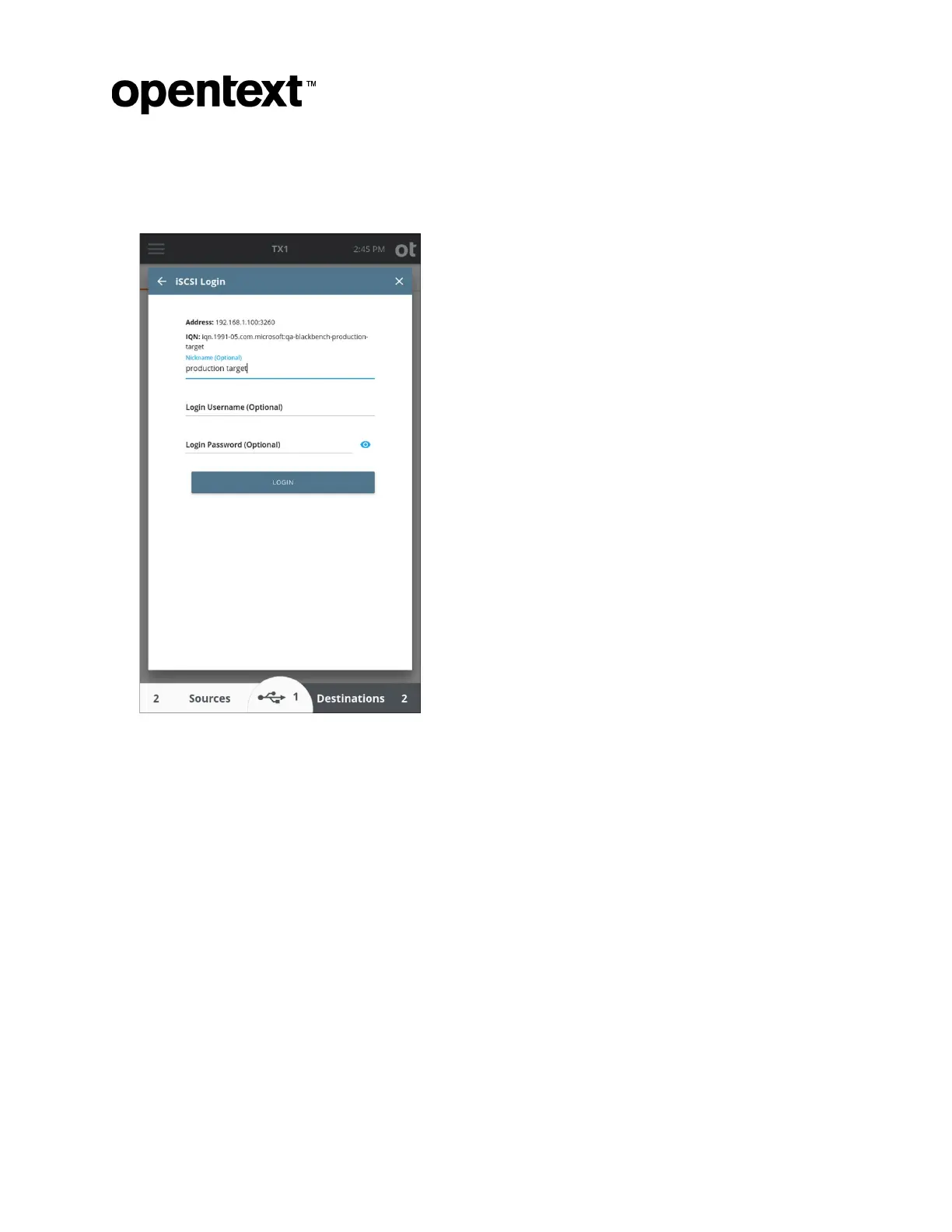 4. Tap an iSCSI target and the iSCSI Login screen is displayed. If needed, enter a