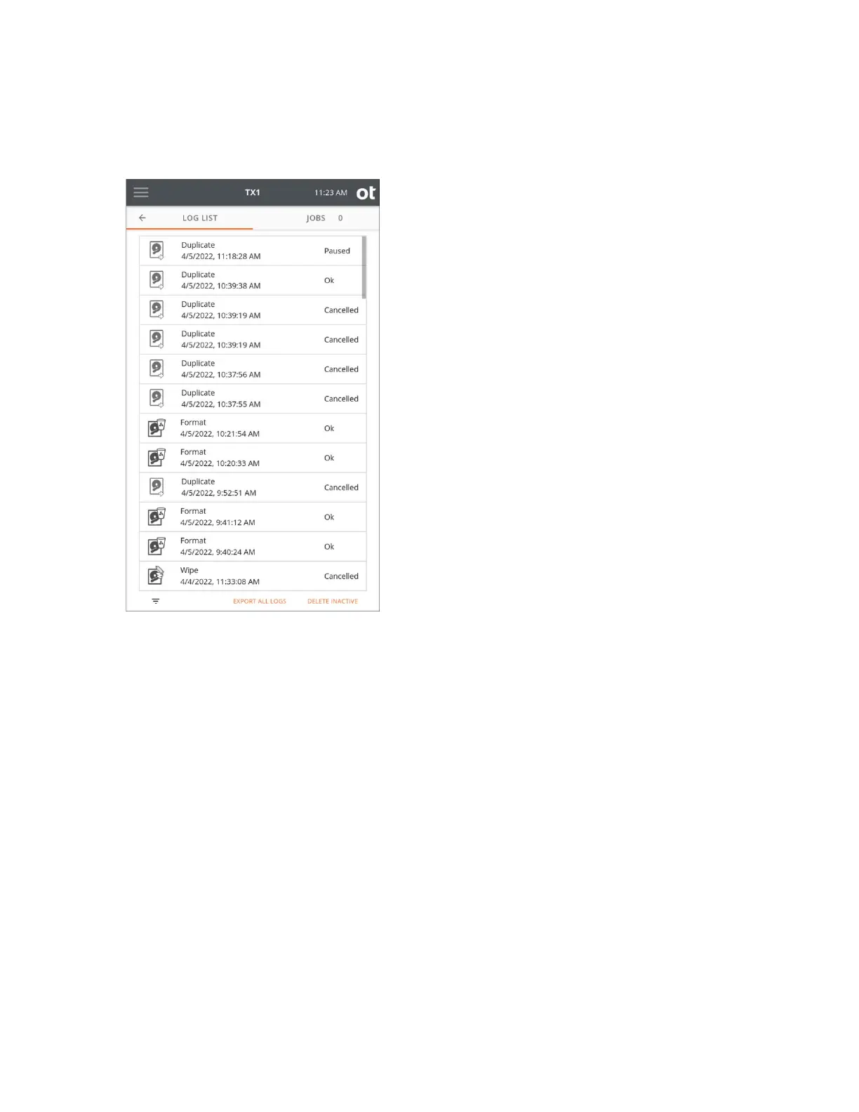 2. Tap the Logs menu item to see a list of all the stored job logs.