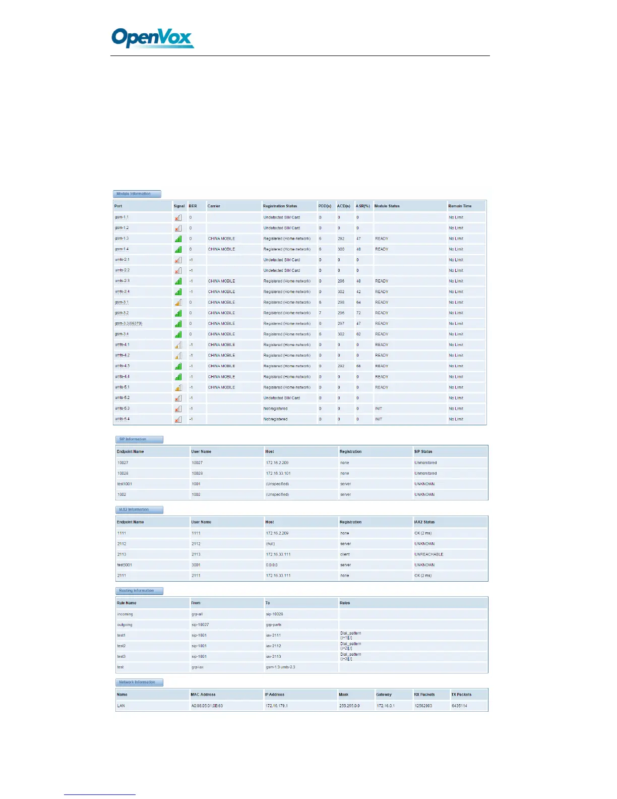 On the “Status” page, you will find all GSM, SIP, IAX2, Routing, Network information and