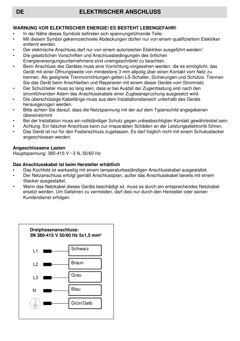 • Der elektrische Anschluss darf nur von einem autorisierten Elektriker ausgeführt werden!