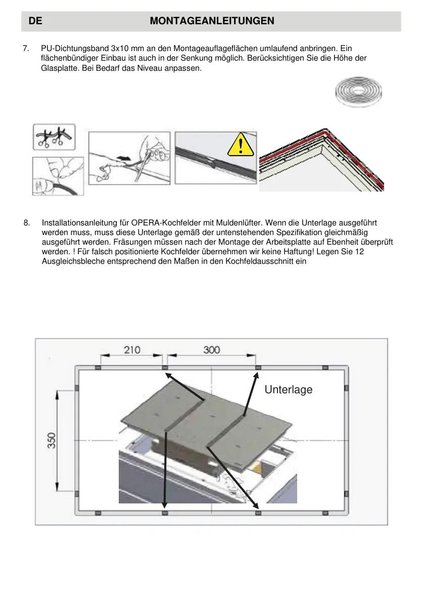 Installationsanleitung für OPERA-Kochfelder mit Muldenlüfter. Wenn die Unterlage ausgeführt