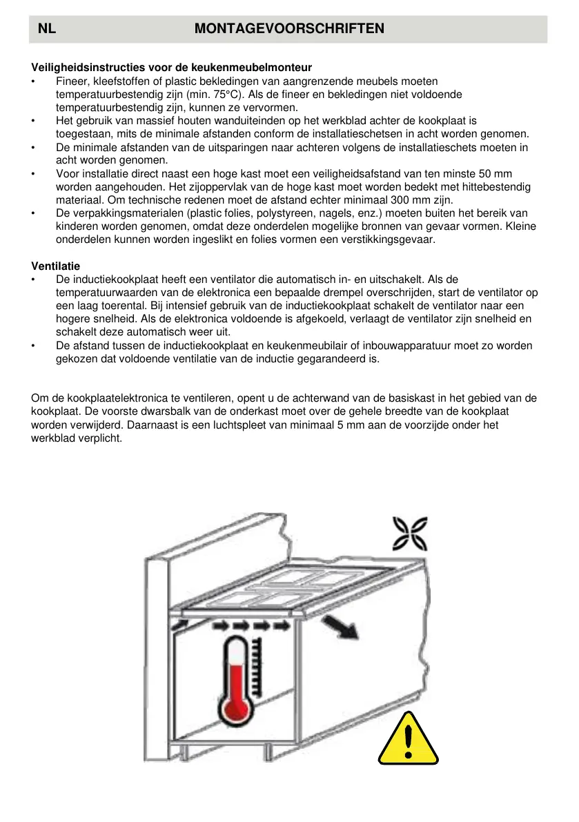 • De afstand tussen de inductiekookplaat en keukenmeubilair of inbouwapparatuur moet zo worden
