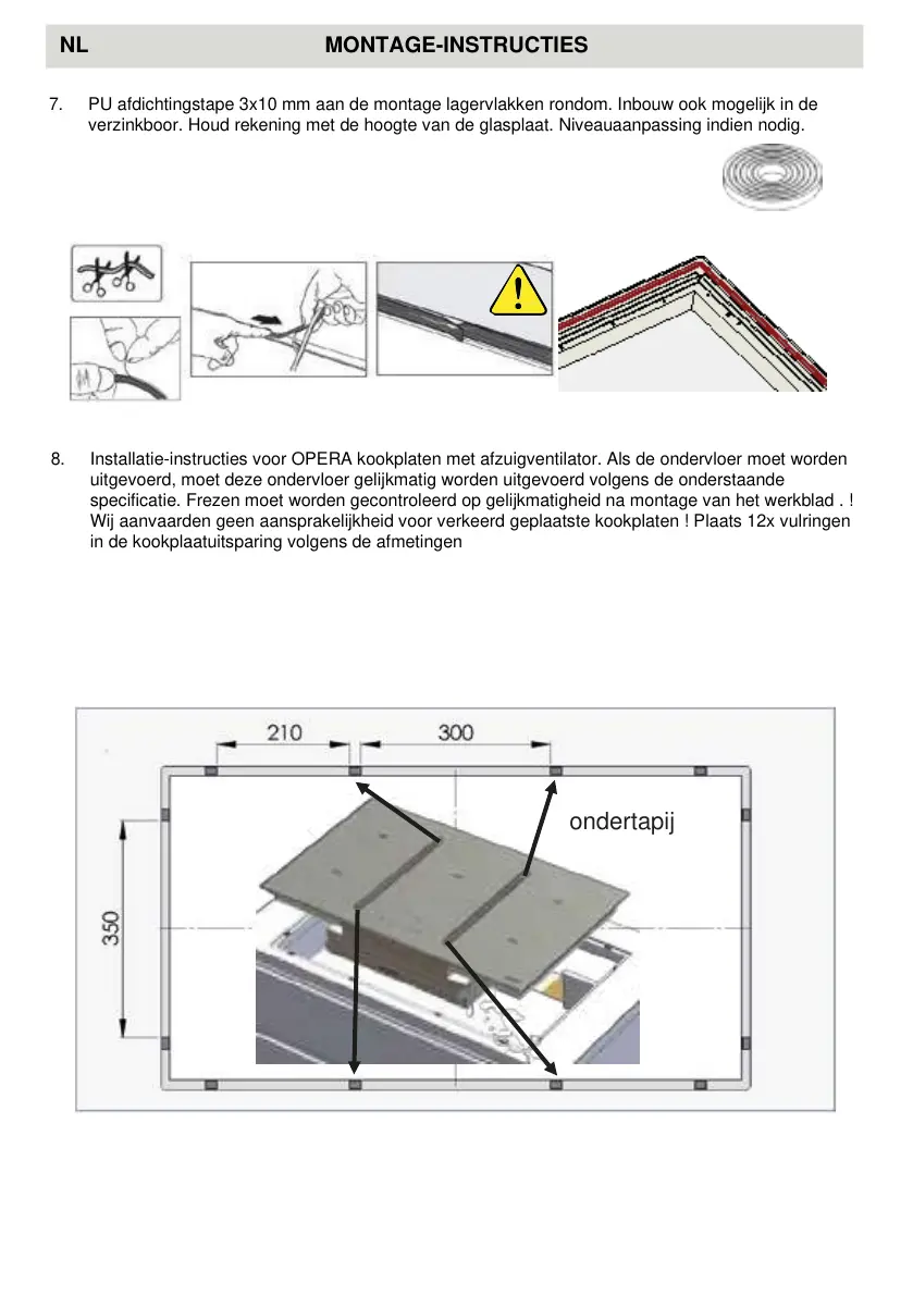 Installatie-instructies voor OPERA kookplaten met afzuigventilator. Als de ondervloer moet worden