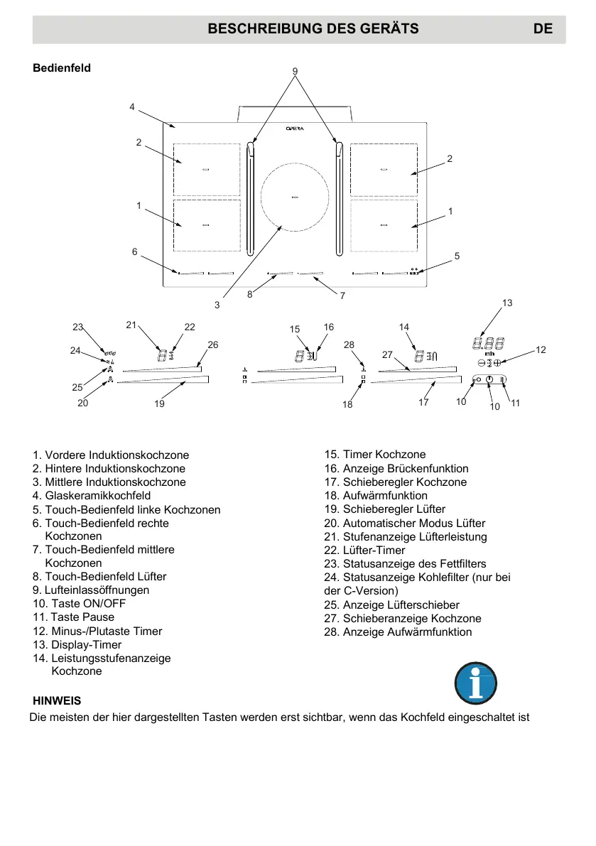 Die meisten der hier dargestellten Tasten werden erst sichtbar, wenn das Kochfeld eingeschaltet ist