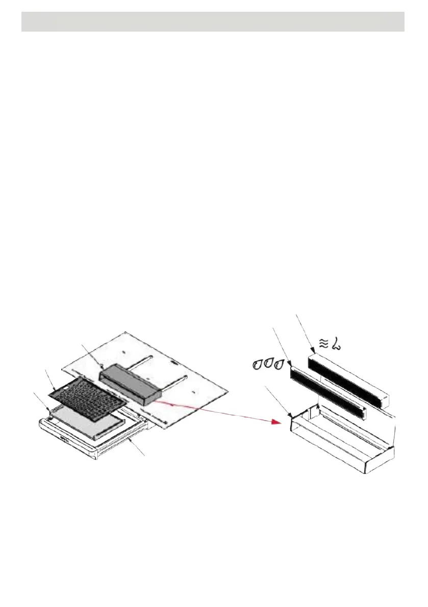 Um Zugang zu den Fettfiltern (5) und Aktivkohlefiltern (6) zu erhalten, öffnen Sie die Filterschublade