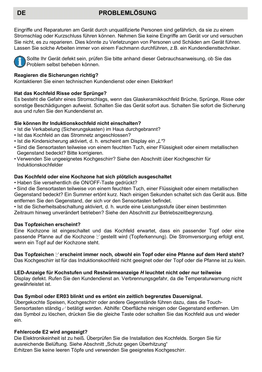 Display defekt. Rufen Sie den Kundendienst an. Verbrennungsgefahr, da die Temperaturwarnung nicht