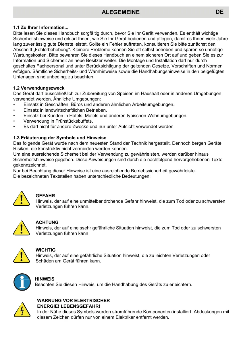 Das Gerät darf ausschließlich zur Zubereitung von Speisen im Haushalt oder in anderen Umgebungen