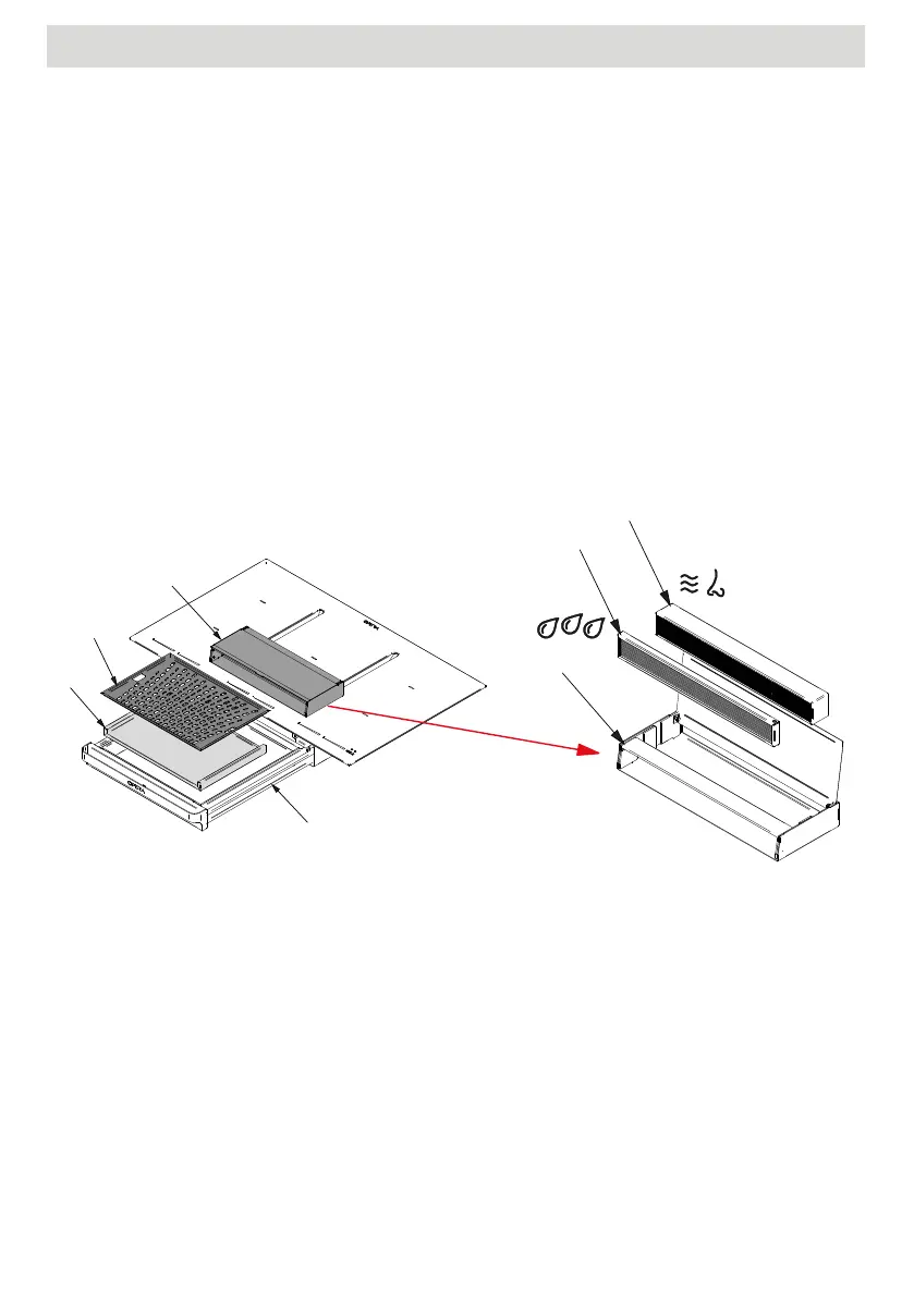 To gain access to the grease (5) and activated carbon (6) filters, open the filters drawer (1) and remove