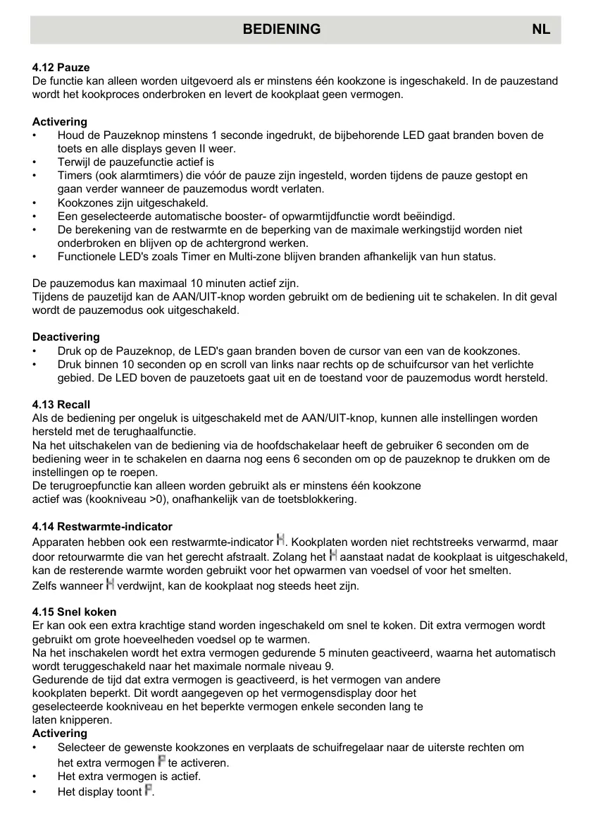 • Druk op de Pauzeknop, de LED's gaan branden boven de cursor van een van de kookzones.